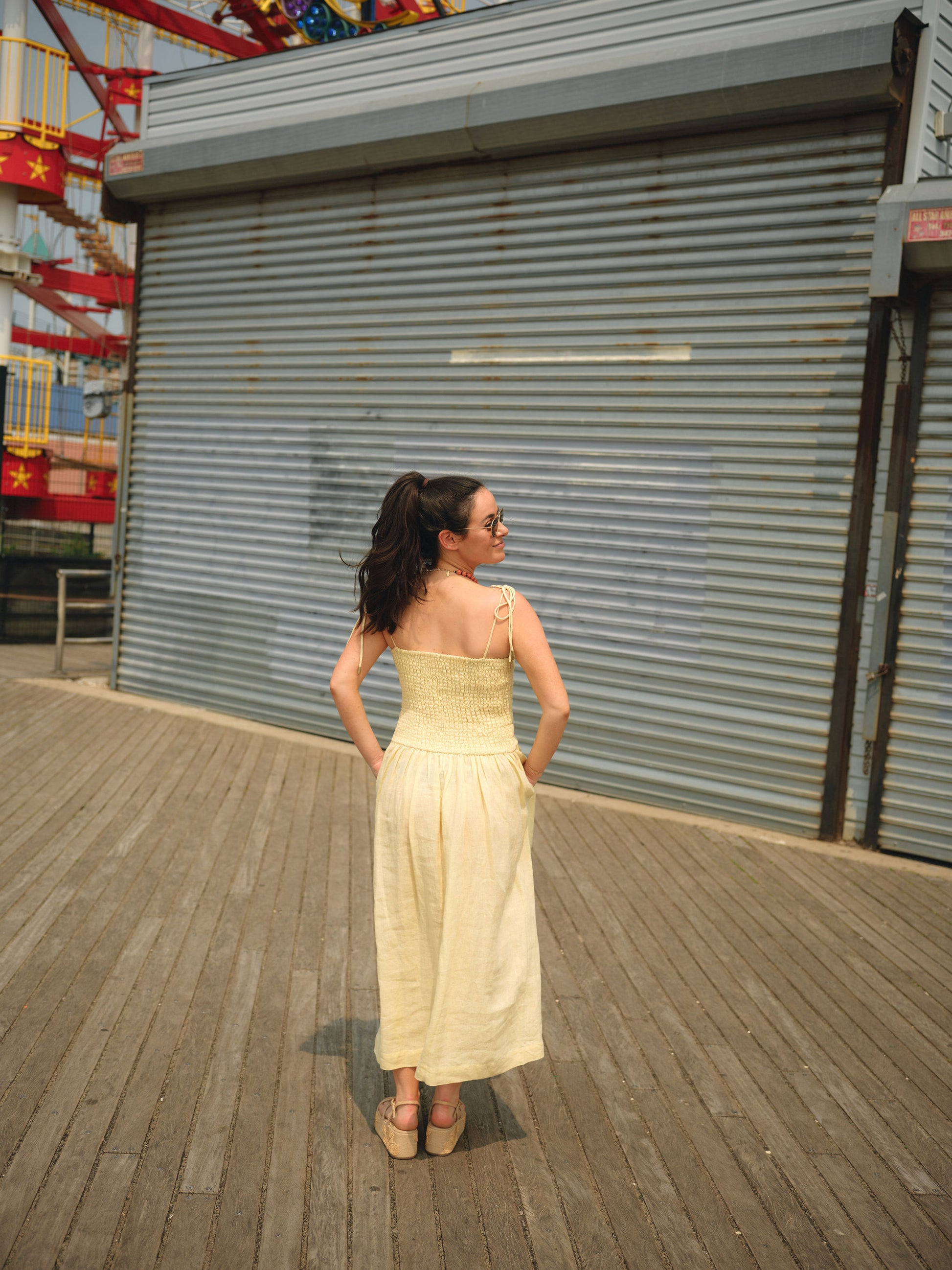 Cut from luxurious 100% linen in a rich butter yellow, the Caroline Dress brings effortless elegance to your warm-weather wardrobe. The ruched bodice creates beautiful texture and a flattering fit, while the gusseted back ensures comfortable movement. Self-tie straps allow for customizable coverage and the perfect shoulder fit. Thoughtfully designed with hidden side pockets and a flowing maxi length that grazes the ankles.